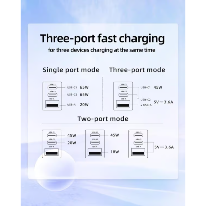 The charger features intelligent dynamic power sharing. The total output is capped at 65W. When all ports are used, it will smartly allocate power, typically prioritizing the laptop-connected USB-C port while providing sufficient power to the other devices.