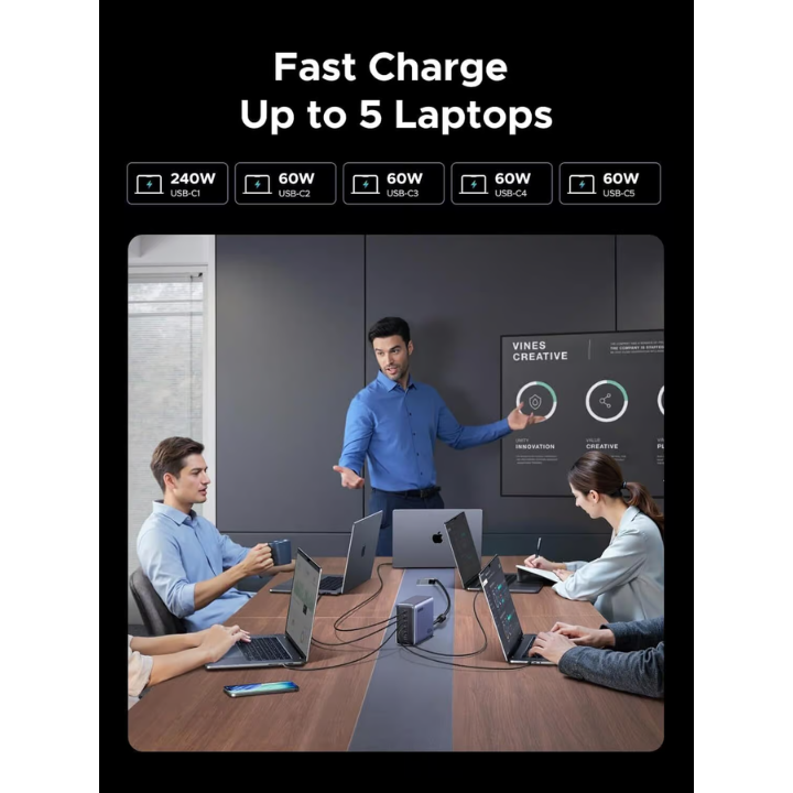 Harnessing the efficiency of advanced GaN II technology, it packs an immense 500W of power into a space-saving design. The standout 240W PD 3.1 USB-C port is a game-changer, delivering enough power to charge a high-performance laptop like a MacBook Pro or a Dell XPS 17 while you use it intensively. The four additional 100W USB-C ports can simultaneously charge other laptops, iPads, and phones, while the 20W USB-A port handles smaller accessories like your Bluetooth headphones or smartwatch.