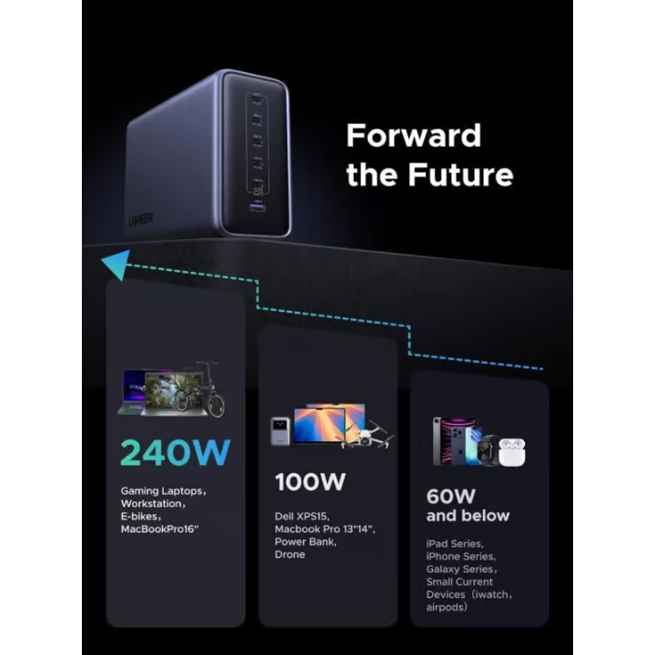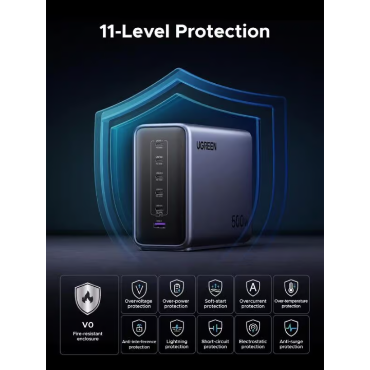 Safety is paramount. The charging station is equipped with a sophisticated 11-level safety protection system and intelligent NTC temperature control that monitors and adjusts performance in real-time to prevent overheating, ensuring your valuable devices are always safe. This makes it the perfect, reliable core for your home office setup or a streaming station. To build your ultimate workstation, pair it with a UGREEN USB-C hub for connectivity and high-quality USB-C to USB-C cables to unlock the full 240W potential.