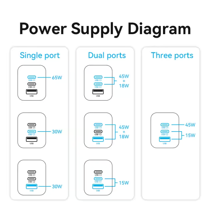 - USB-C1 + USB-C2 + USB-A: 45W (USB-C1) + 15W (USB-C2 + USB-A)