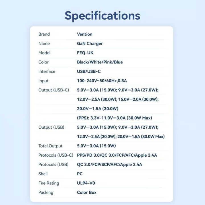 • Package Includes: VENTION GaN III 30W Charger + User Manual