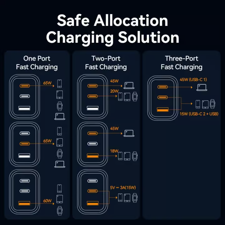 - Three-Port Charging – Features dual USB-C ports and one USB-A port, allowing you to charge three devices simultaneously.