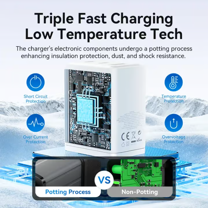 Featuring dual USB-C ports (PD 3.0) and one USB-A port (QC 4.0), this charger supports simultaneous charging of up to three devices while intelligently distributing power. Whether you need to fast charge an iPhone 16/15/14, power a MacBook, or charge a Samsung Galaxy S25/S24/S23, this charger delivers optimal performance.