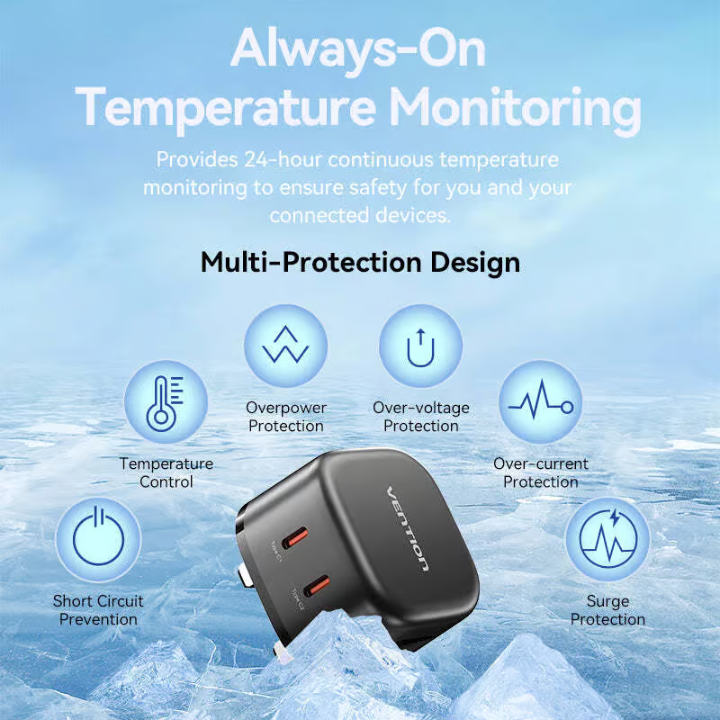 Its built-in safety features, such as over-voltage, over-current, short-circuit, and temperature protection, keep your devices safe during charging. The fireproof PC shell and intelligent temperature control chip help maintain a cool and stable charging experience, even during prolonged use.
