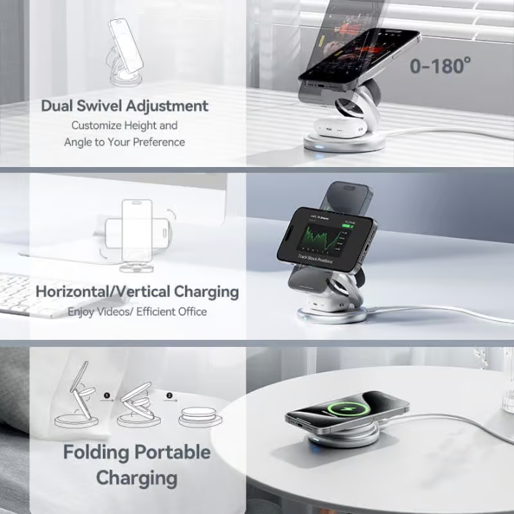 Featuring a 360° rotating base, this charger offers unparalleled flexibility, allowing you to adjust your devices to the perfect viewing angle while charging. The strong magnetic hold ensures your iPhone stays securely in place, preventing slipping or misalignment during charging.