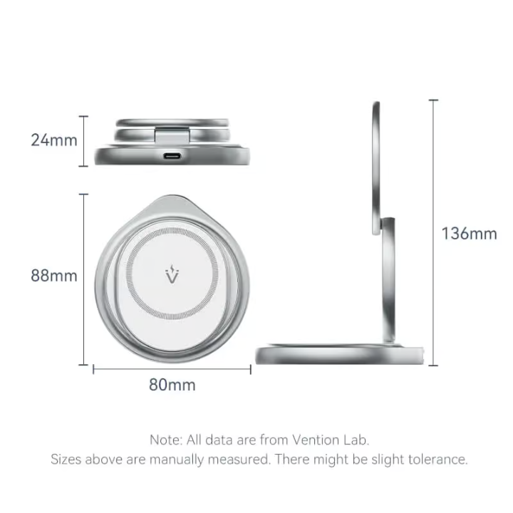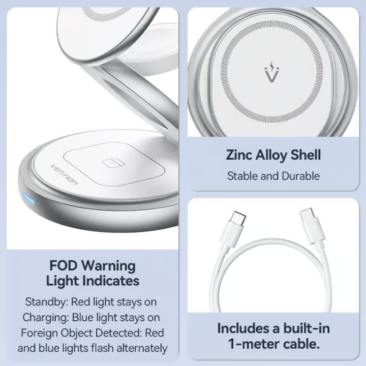 Built with premium zinc alloy die-casting and ABS material, the charger is both durable and stylish. Its nickel-plated silver finish adds a touch of elegance, making it a perfect addition to any workspace or bedside table. The charger supports QC/PD input protocols and delivers 15W fast wireless charging for MagSafe-compatible iPhones, 2.5W for Apple Watch, and 3W for AirPods, ensuring fast and efficient charging for all your devices.
