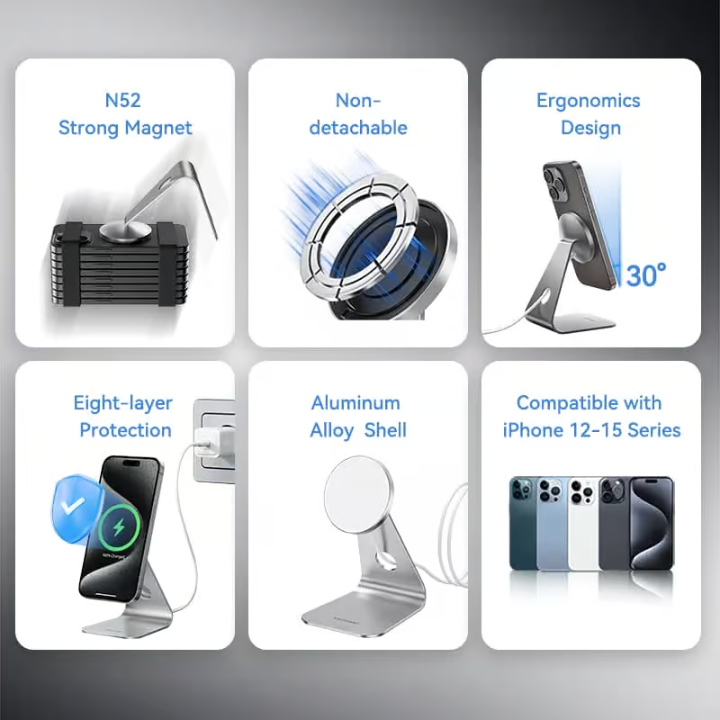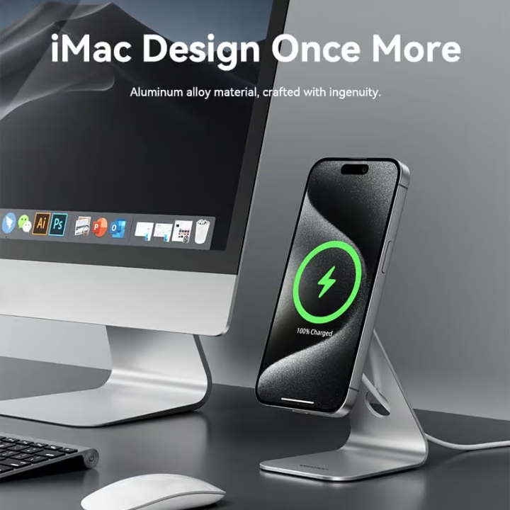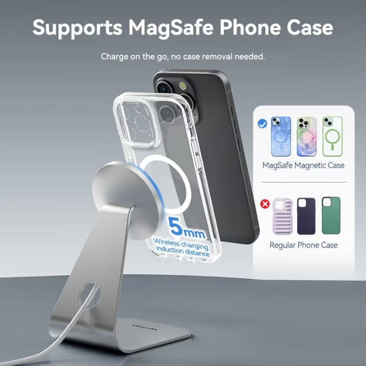 The aluminum alloy body ensures efficient heat dissipation, and the 5N magnetic array holds devices firmly even in portrait or landscape mode. Compatible with MagSafe cases (or slim non-MagSafe cases under 5mm), it’s ideal for bedside tables, desks, or travel.