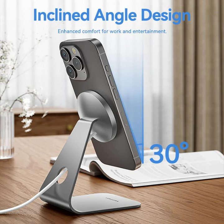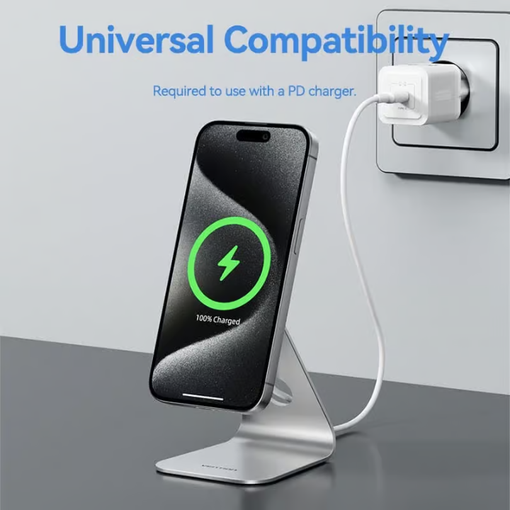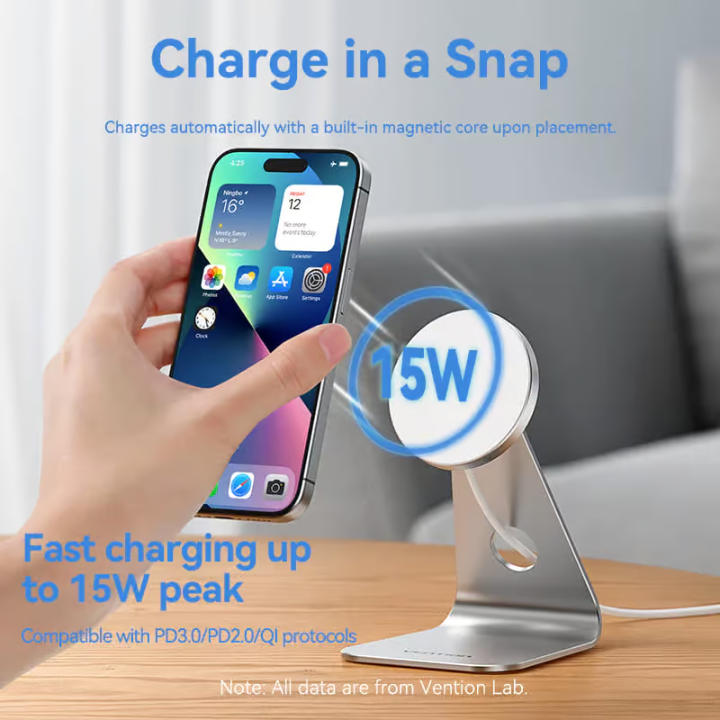 The Vention Magnetic Wireless Charger combines fast 15W charging with elegant functionality. Its strong magnets snap your iPhone into perfect alignment every time, while the 30° tilt offers hands-free convenience for video calls or notifications.