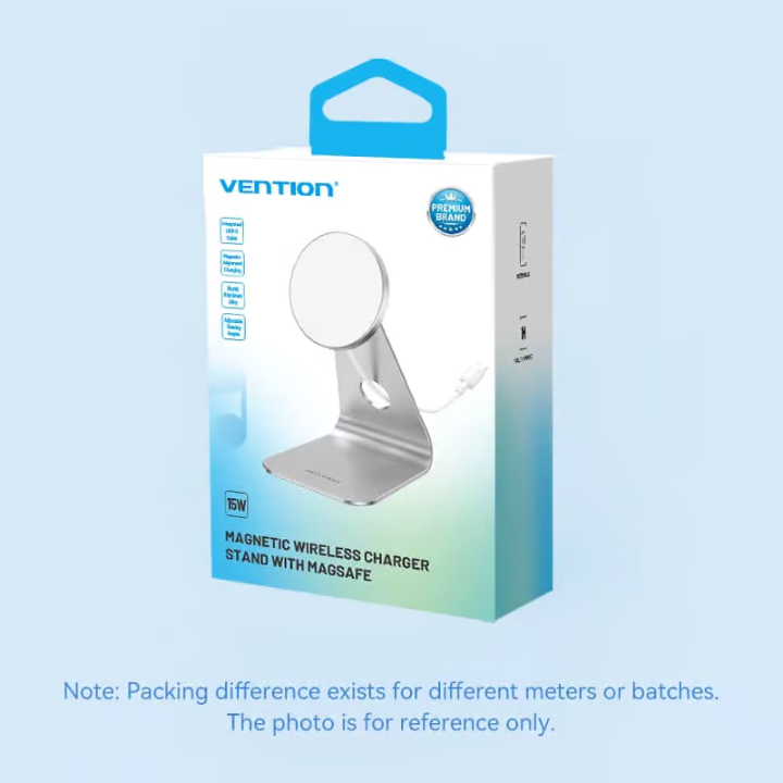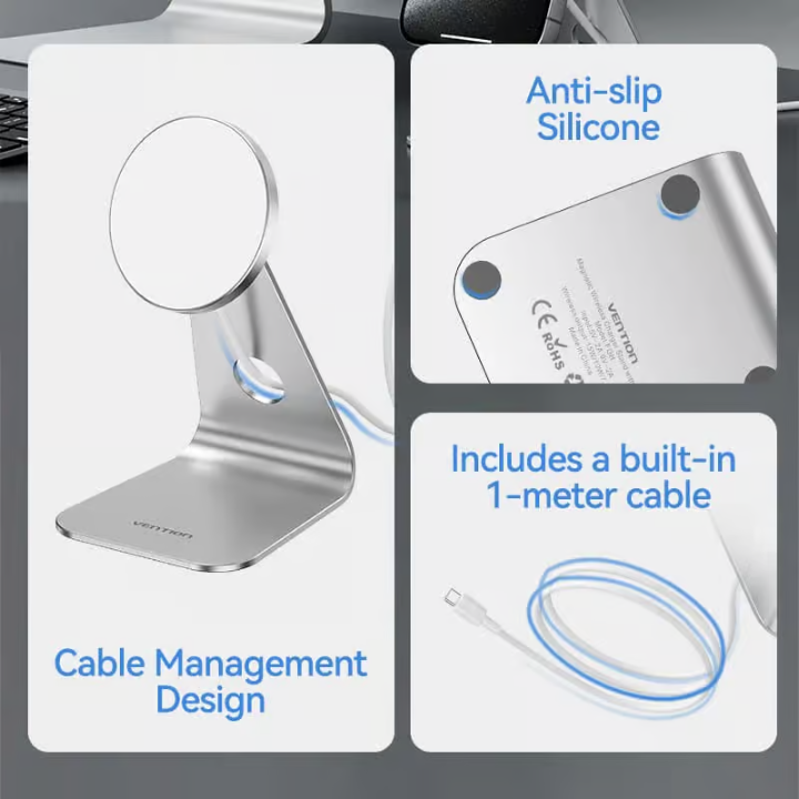 VENTION FGHIF 15W Magnetic Wireless Charger Stand – MagSafe Compatible Fast Charging, Aluminum Alloy Cooling, 30° Adjustable Angle for iPhone 12/13/14/15/16 Series (1M Cable, Silver)