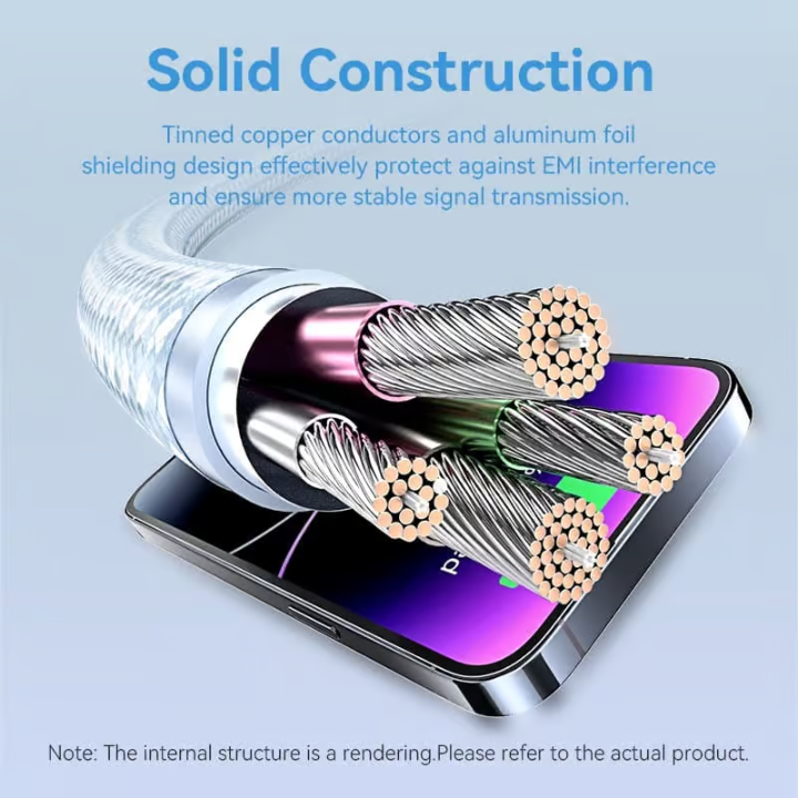 Built to last, the Vention Lightning cable features a nylon braided jacket and aluminum alloy shell, providing superior durability and resistance to tangling. The nickel-plated connectors and tinned copper conductors ensure optimal conductivity and corrosion resistance, while the aluminum foil shielding protects against interference.
