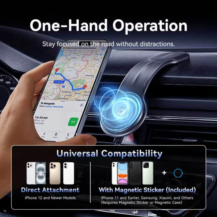 - Super-Strong Magnetic Hold – 6 embedded magnets keep your phone secure even on bumpy roads (works with MagSafe cases).