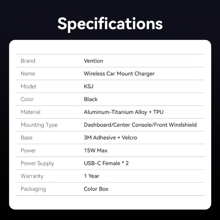 - 1 x Vention Wireless Car Charger